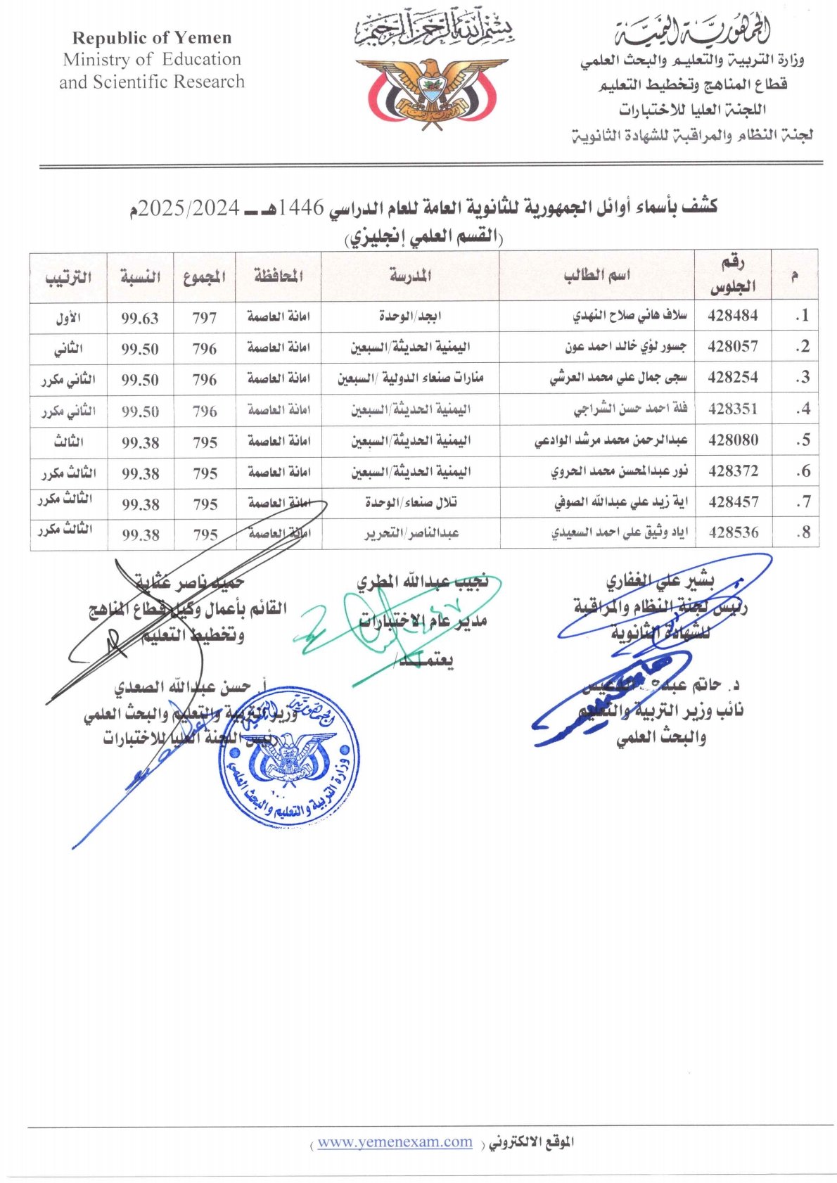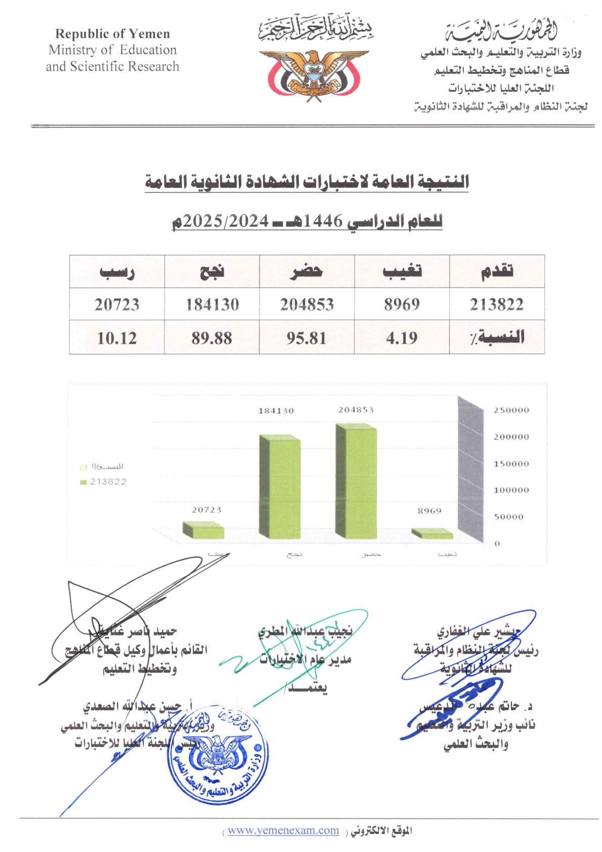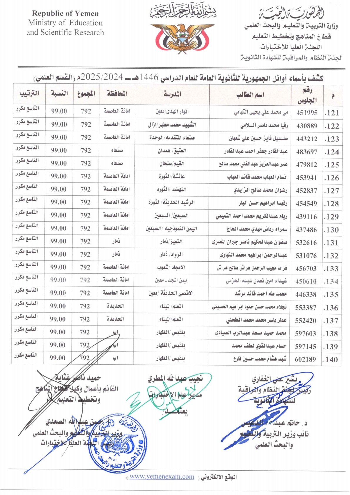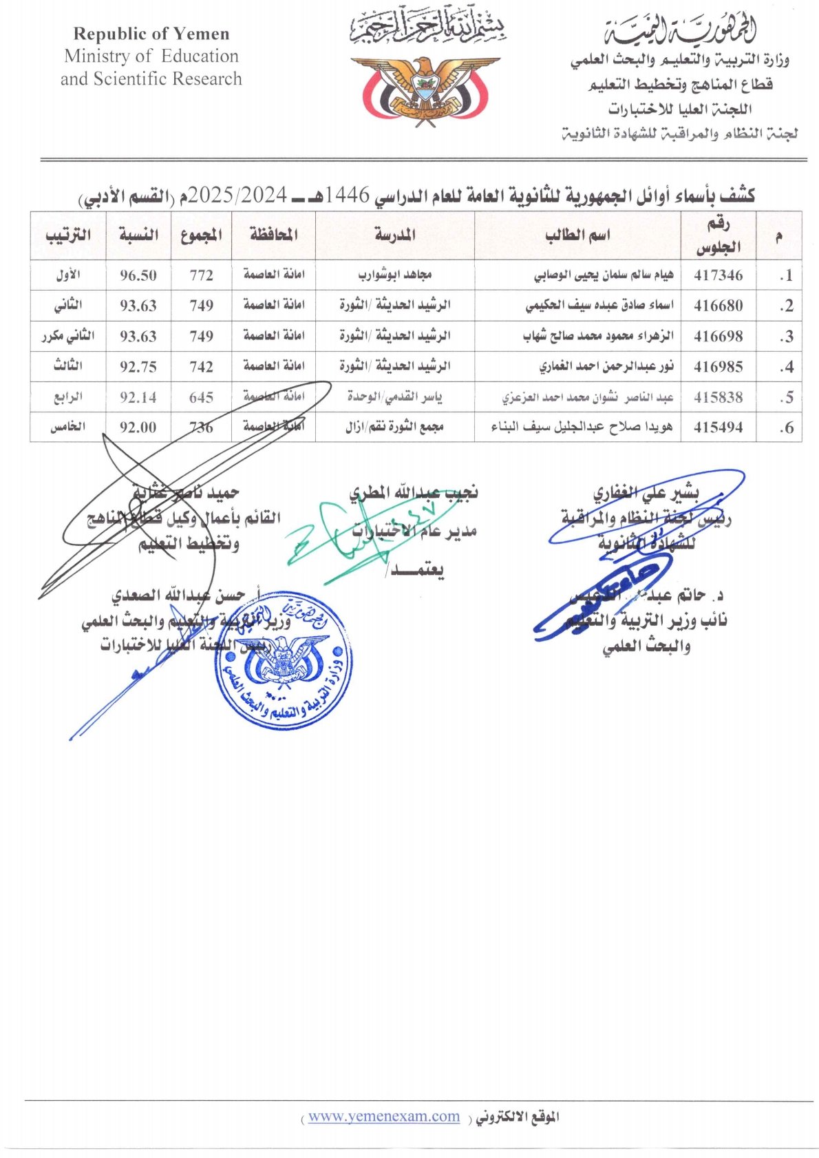 كشوفات أوائل الجمهورية للشهادة الثانوية ثالث ثانوي لكافة الأقسام (علمي ـ أدبي ـ انجليزي) مع احصائية النتيجة، للعام الدراسي ١٤٤٦ﮪ ـ ٢٠٢٥/٢٠٢٤م صور وملف بي دي اف pdf