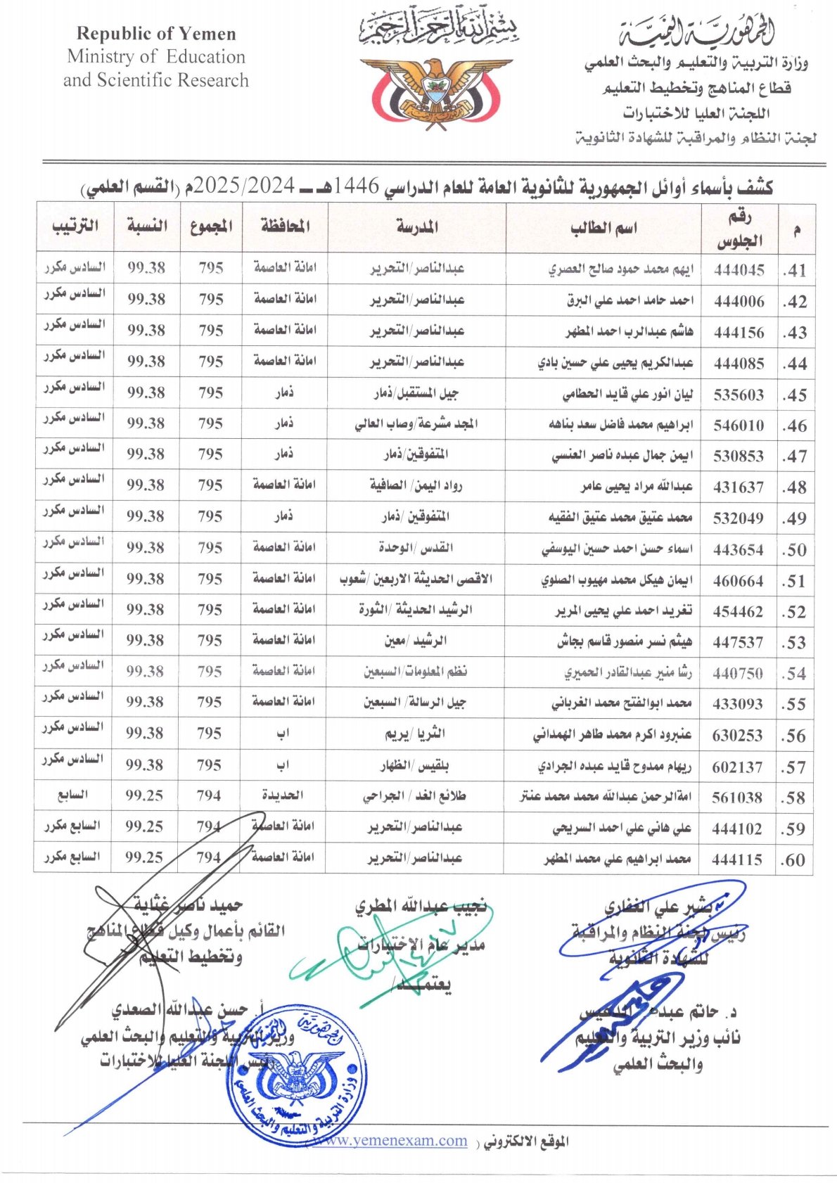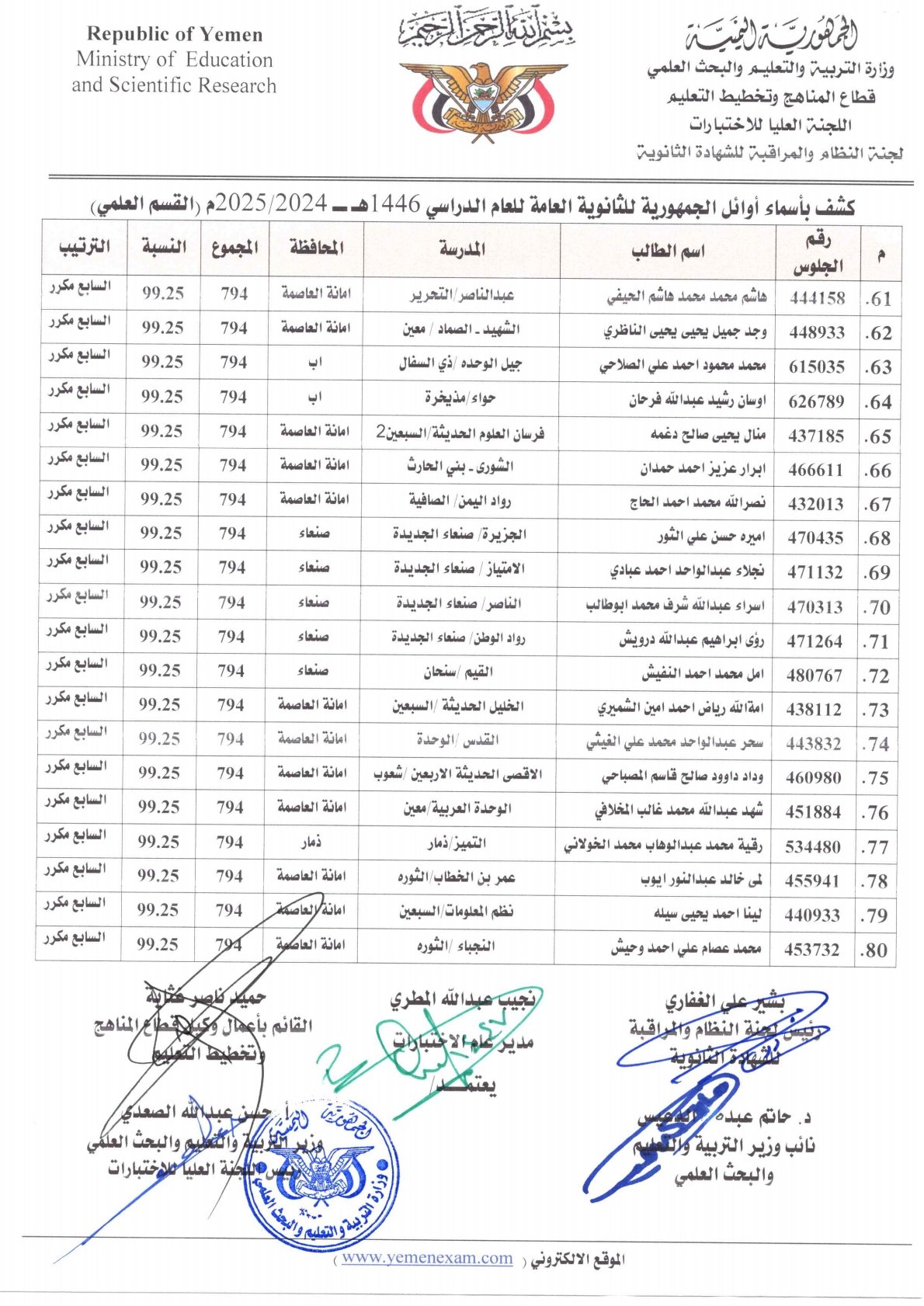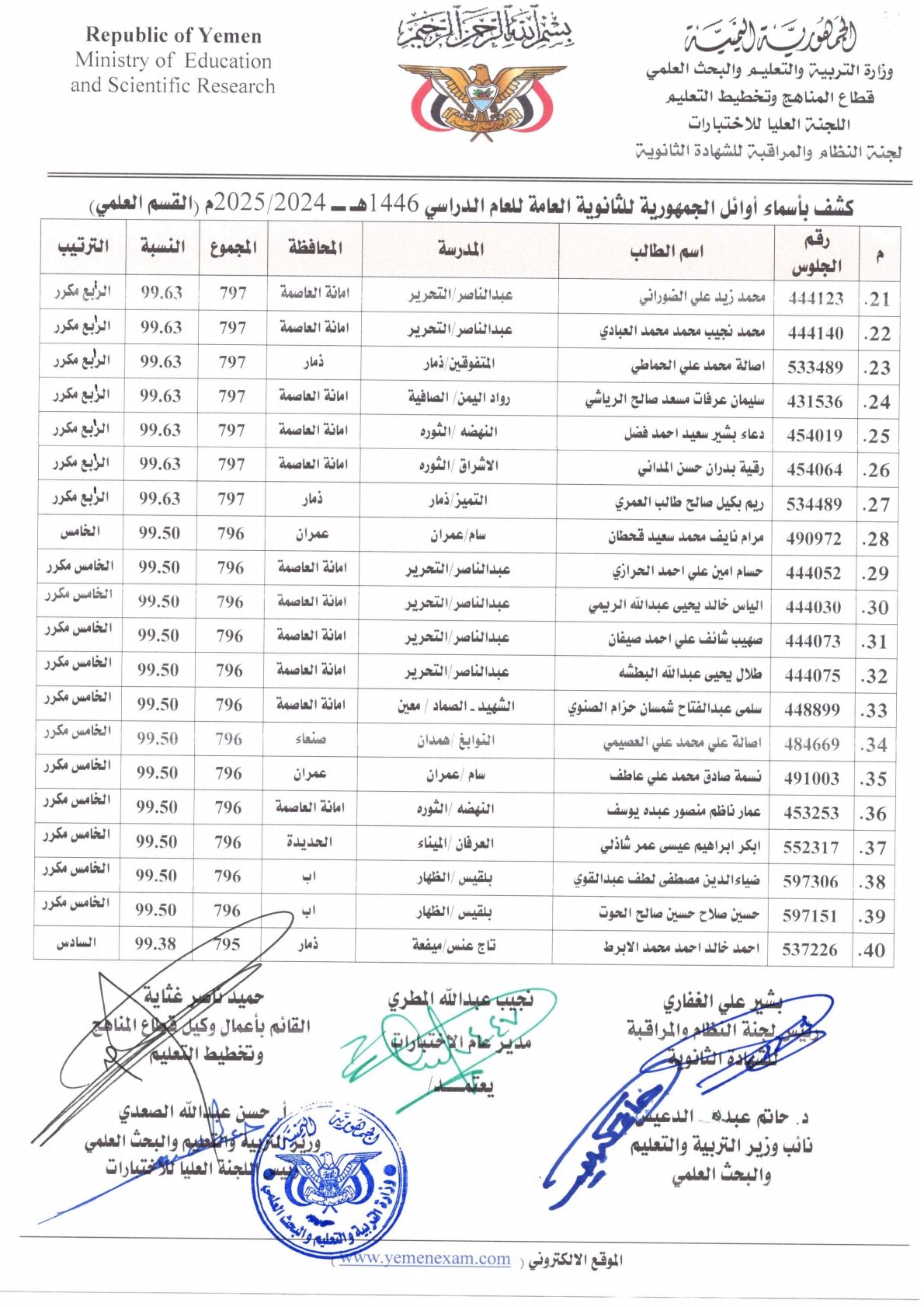 كشوفات أوائل الجمهورية للشهادة الثانوية ثالث ثانوي لكافة الأقسام (علمي ـ أدبي ـ انجليزي) مع احصائية النتيجة، للعام الدراسي ١٤٤٦ﮪ ـ ٢٠٢٥/٢٠٢٤م صور وملف بي دي اف pdf