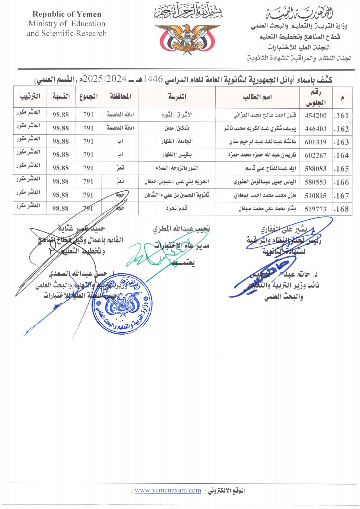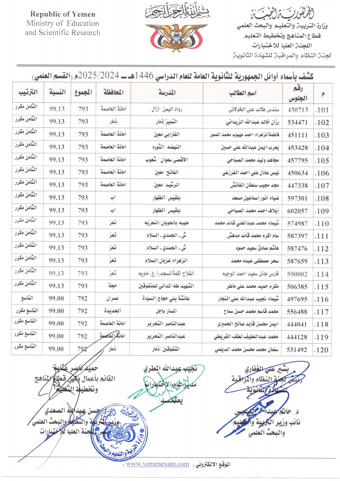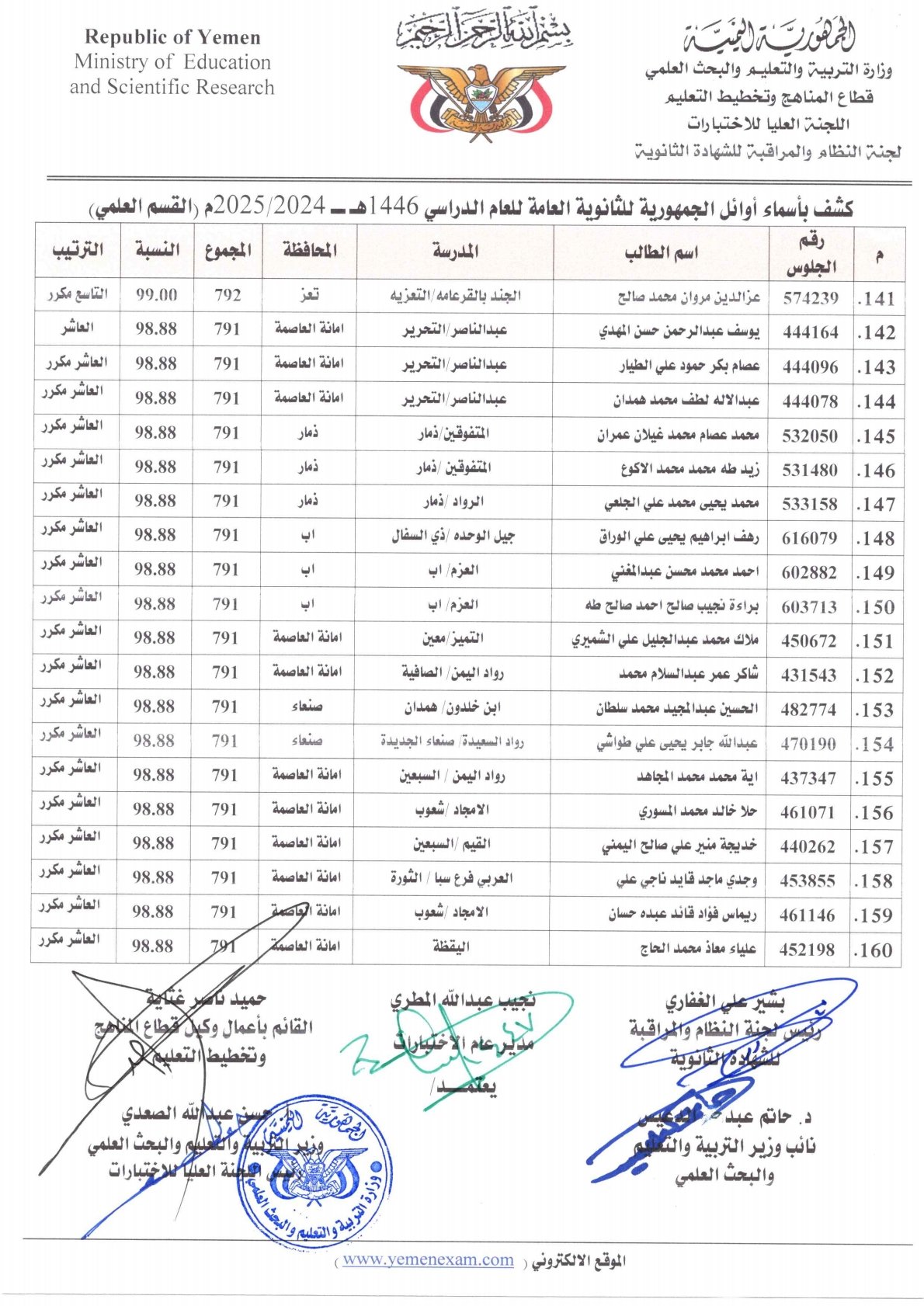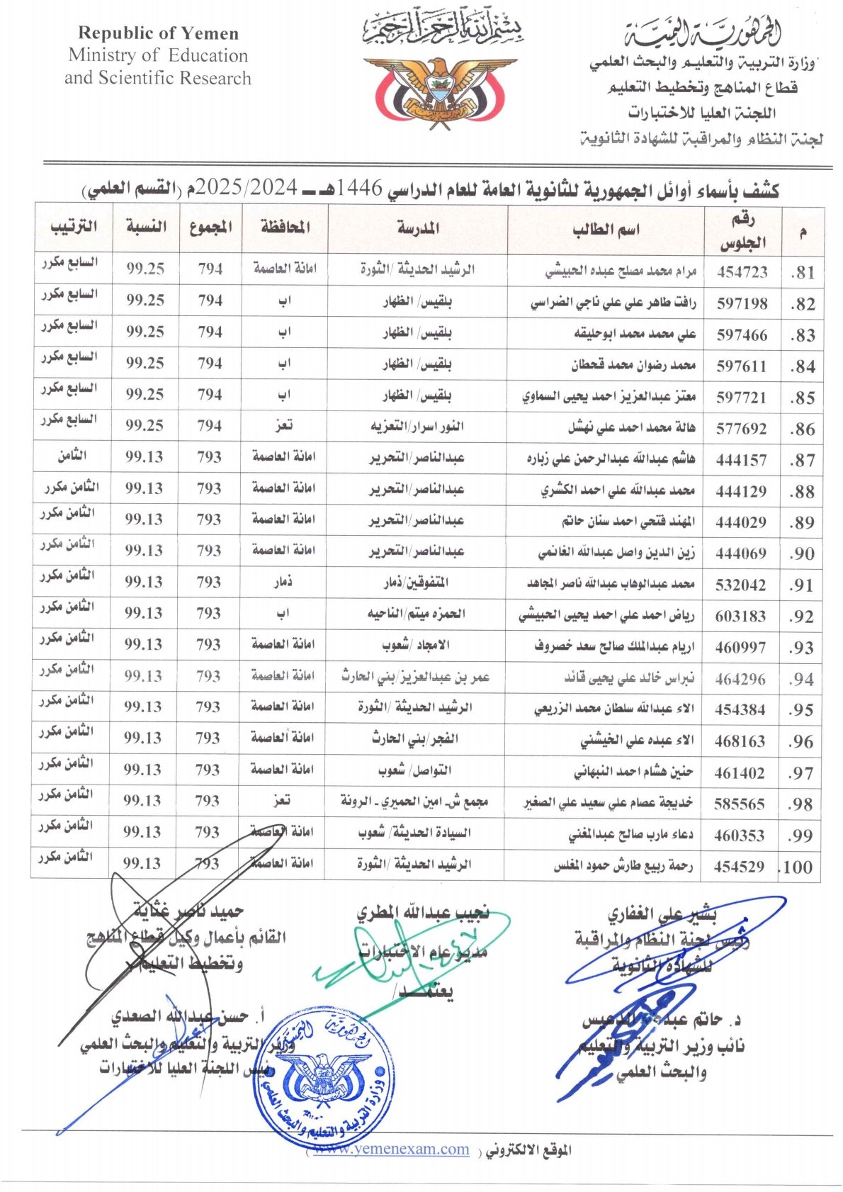 كشوفات أوائل الجمهورية للشهادة الثانوية ثالث ثانوي لكافة الأقسام (علمي ـ أدبي ـ انجليزي) مع احصائية النتيجة، للعام الدراسي ١٤٤٦ﮪ ـ ٢٠٢٥/٢٠٢٤م صور وملف بي دي اف pdf