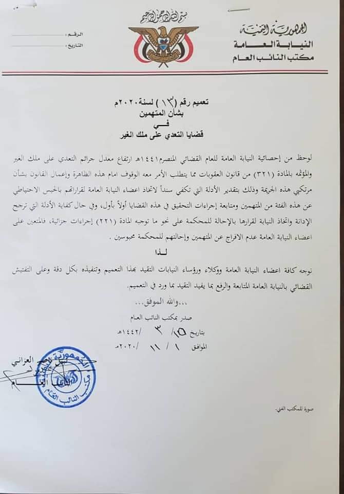 وجاء في التعميم الذي صدر بتاريخ 2020/11/1م، انه “لوحظ من إحصائية النيابة العامة للعام القضائي المنصرم 1441ه ارتفاع معدل جرائم التعدي على ملك الغير والمؤثمه بالمادة (321) من قانون العقوبات”.