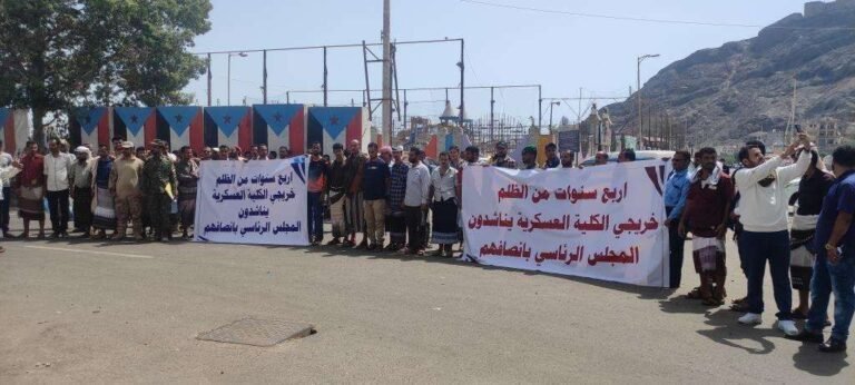المشاركون في الوقفة الاحتجاجية رفعوا لافتات، كُتب عليها: “أربع سنواتٍ من الظلم.. خريجو الكلية العسكرية يناشدون المجلس الرئاسي إنصافهم”.