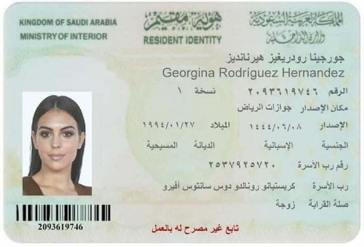 وانشغل السعوديون بصديقة رونالدو “الفاتنة”، ونشر مغردون عبر موقع “تويتر”، صورا معدلة بـ”الفوتوشوب” لهوية إقامة جورجينا رودريغيز عند انتقالها للعيش في الرياض.