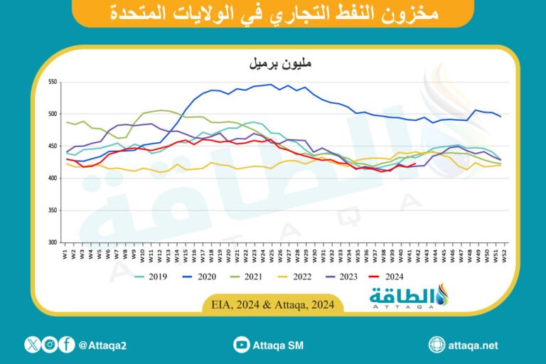 وصعد مخزون الخام في الولايات المتحدة بنحو 5.5 مليون برميل، خلال الأسبوع المنتهي 18 أكتوبر/تشرين الأول 2024، ليصل الإجمالي إلى 426 مليون برميل، وفق تقرير حديث حصلت وحدة أبحاث الطاقة (مقرها واشنطن) على نسخة منه.