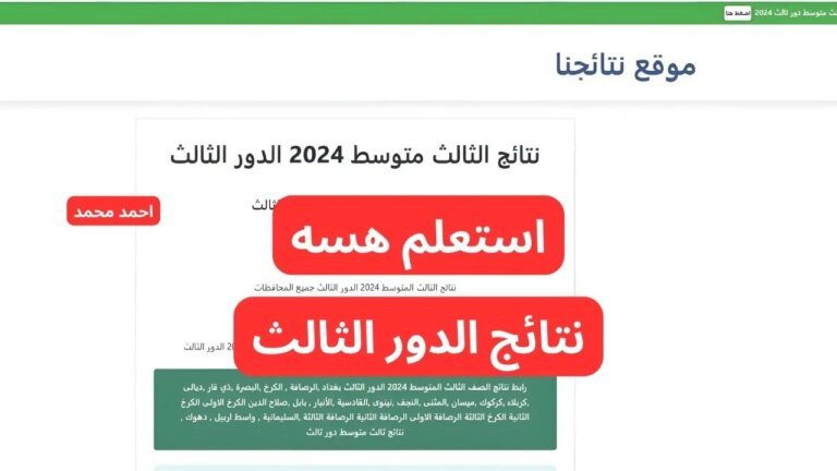 نقدم رابط نتائج الصف الثالث متوسط الدور الثالث 2024 PDF جميع المحافظات العراقية، حيث أعلنت وزارة التربية العراقية رسميًا عن صدور نتيجة الثالث متوسط دور ثالث للعام 2024، ويمكن للطلاب الآن الوصول إلى نتائجهم بسهولة عبر المنصات الرسمية التي توفرها الوزارة وموقع “نتائجنا”، في هذا المقال، نستعرض كيفية الاستعلام عن نتائج الثالث متوسط دور ثالث عبر المواقع الرسمية للوزارة وموقع نتائجنا المعتمد.
