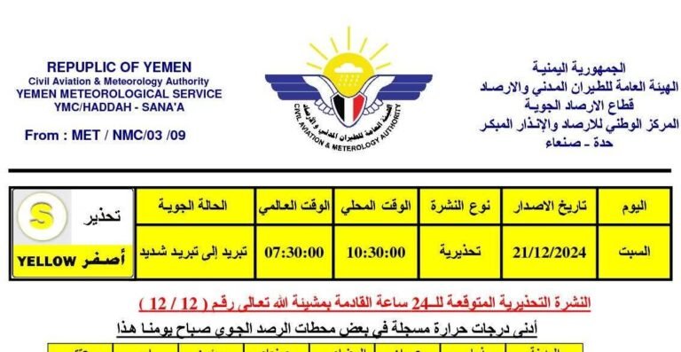 أصدر المركز الوطني للأرصاد والإنذار المبكر النشرة التحذيرية رقم (12/12) بتاريخ 21/12/2024، محذراً من أجواء باردة إلى شديدة البرودة ستؤثر على عدد من المحافظات خلال الساعات القادمة.